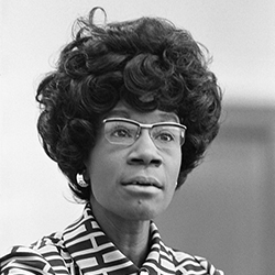 Shirley Anita St. Hill Chisholm foi uma política, educadora e autora norte americana. Ela foi a primeira mulher negra eleita no Congresso dos Estados Unidos em 1968, representando o 12º Distrito Congressista de Nova Iorque por 7 mandatos, de 1969 a 1983. Em 1972, tornou-se a primeira a primeira mulher negra candidata a presidência dos Estados Unidos, e a primeira mulher a concorrer a presidência pelo Partido Democrata.