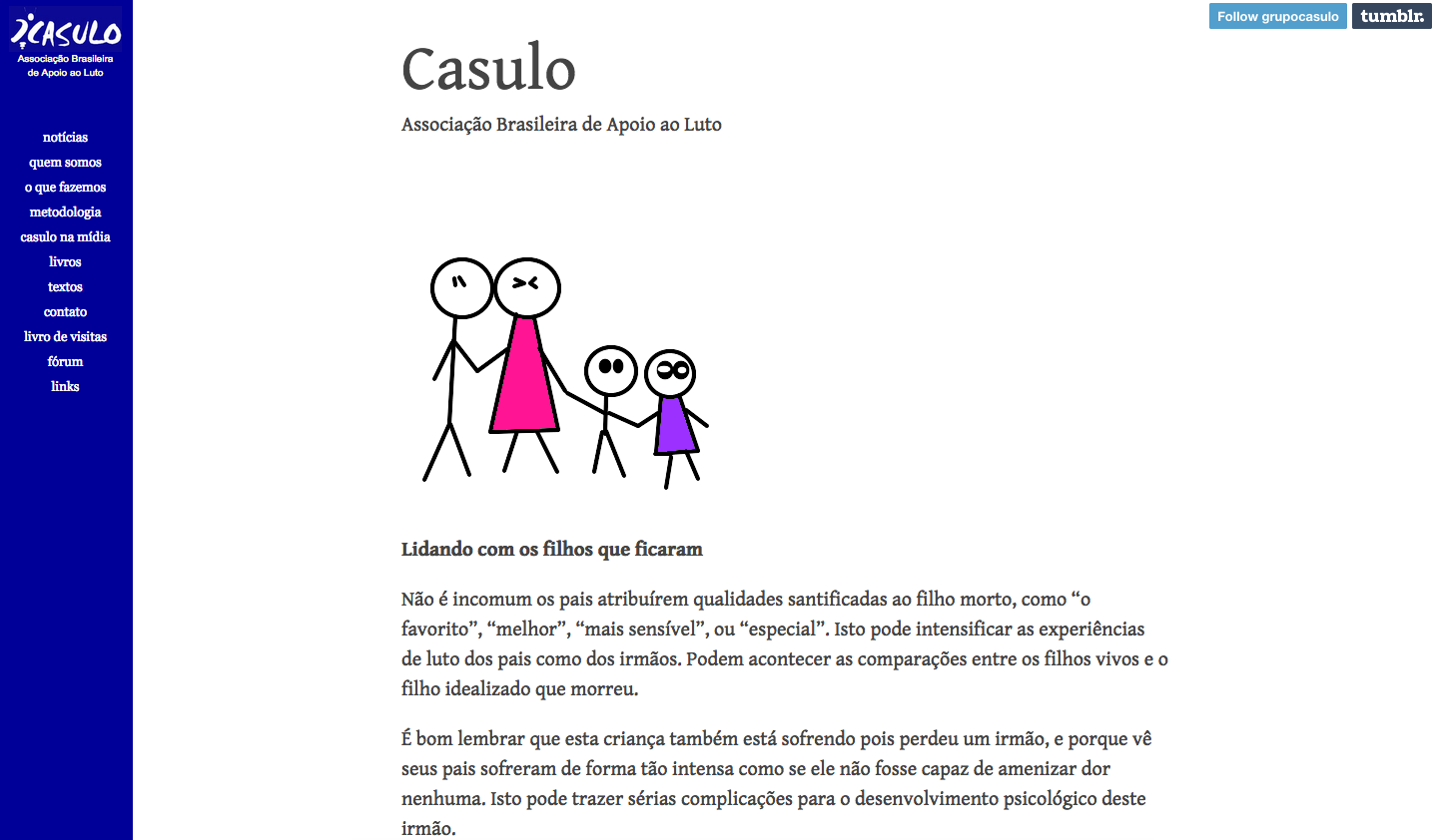 Casulo – Associação Brasileira de Apoio ao Luto – é uma organização da sociedade civil, laica e sem fins lucrativos, criada para apoiar pessoas enlutadas. Neste blog você irá encontrar diversos textos para reconfortar a alma.
